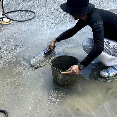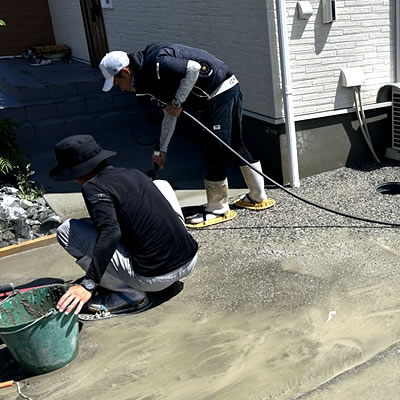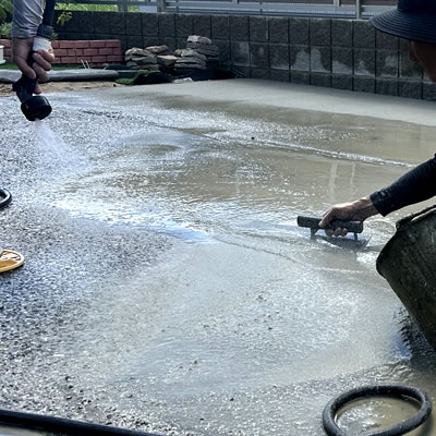 一般的な施工方法はコンクリート打設後にコンクリート表面に遅延材を散布して表面の硬化を遅らせ、一定時間後に表面を洗い流すことで骨材が露出します。